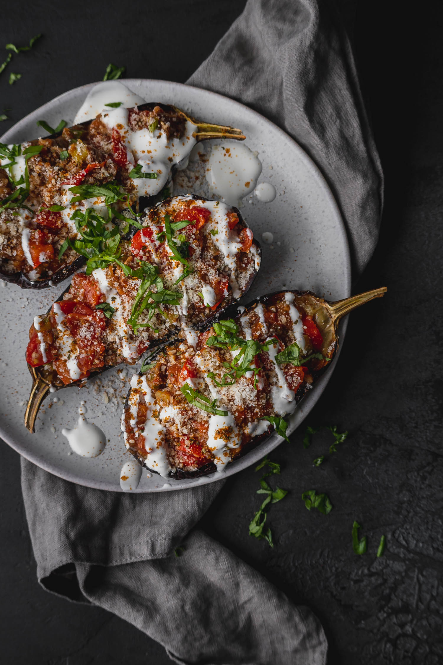 Server dine bagte og fyldte auberginer varme og nyd dem som en lækker og sund vegetarisk hovedret eller som lækkert tilbehør.