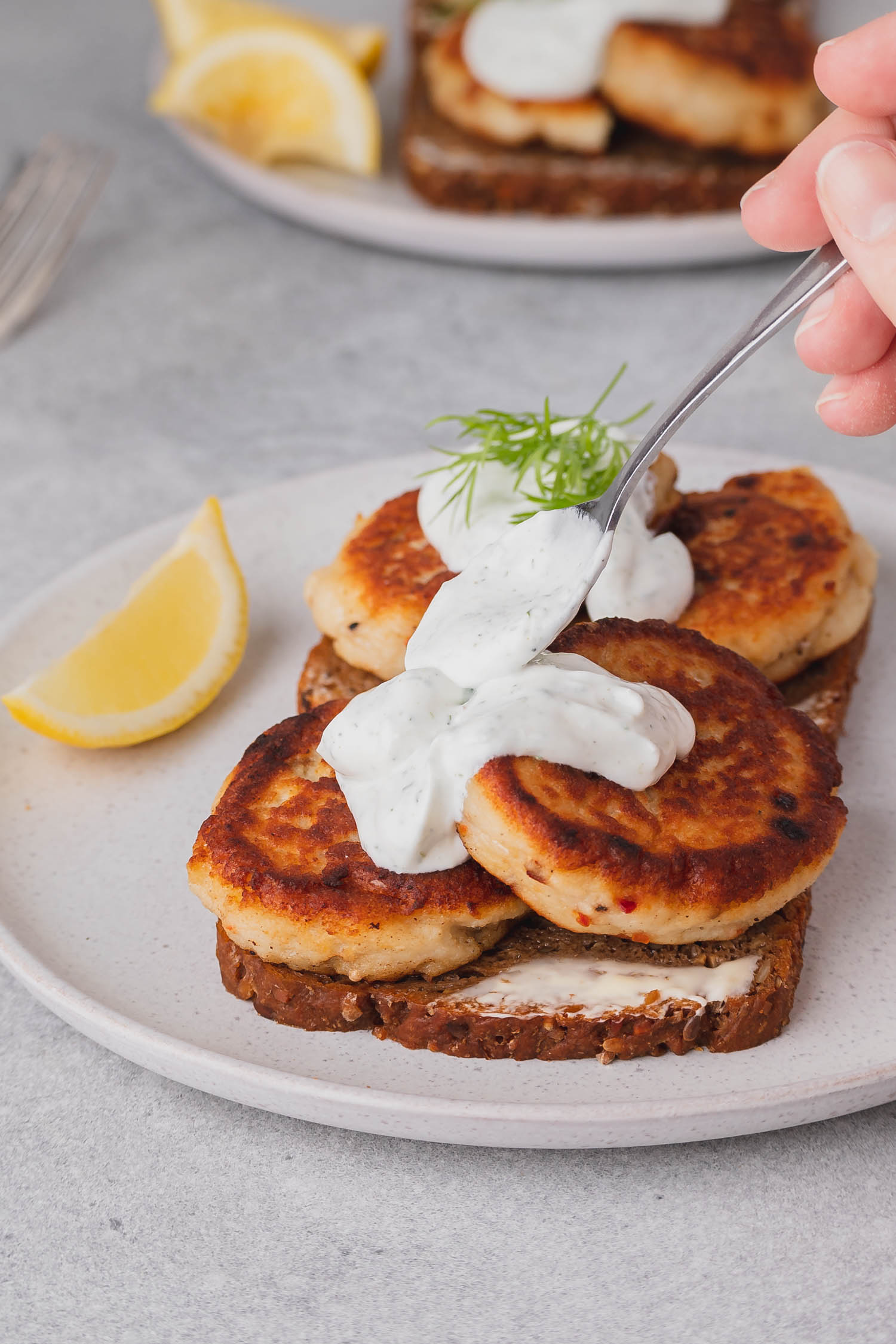 Du kan servere dine fiskefrikadeller, som her, på et stykke friskt rugbrød med en cremet creme fraiche-dip ovenpå. Det er en enkel og lækker måde at servere dine fiskefrikadeller på.